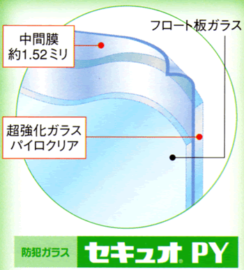超強度の防火ガラス『パイロクリア』とフロート板ガラスの間に約1.52ミリの中間膜を挟み込みました。店舗など大開口の『打ち破り』に抵抗力を発揮します。